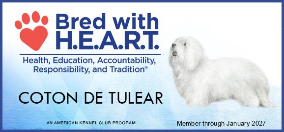 Morninglow Cotons is very happy to be an AKC Breeder of Merit participant. Breeder of Merit is a special recognition awarded by the American Kennel Club to accomplished breeders who have demonstrated their commitment to the preservation and improvement of their chosen breed or breeds, as well as to the promotion of the sport of purebred dogs. BOM participants apply for the honor after five years of documented involvement with AKC, finishing conformation championships on a designated number of dogs of their own breeding, as well as participation in other all-breed and specialty dog clubs. We were thrilled to have been accepted for this honor in January of 2019. We also continue to participate in the American Kennel Club "Bred with H.E.A.R.T." breeder program. Breeders with this designation have made a commitment to perform at least the minimum health tests required on a breed by its AKC parent breed club and have also made a commitment to participate in continuing breeder education programs on a regular basis. Morninglow Cotons does health testing on our active dogs far beyond the minimums required by the United States of America Coton de Tulear Club and also go far beyond what is required by the Orthopedic Foundation for Animals in order to receive OFA's "CHIC" certification. We love to have our dogs win in the show ring, but our first and foremost commitment is to do our very our best to produce HEALTHY Cotons de Tulear with the wonderful temperament that the dog should be known for! To see the testing on our breeding dogs (and even on our retired show dogs), please clink on the health links on each dog on the "Our Cotons" page. We are proud to have made this investment in the health of our future Morninglow dogs!!